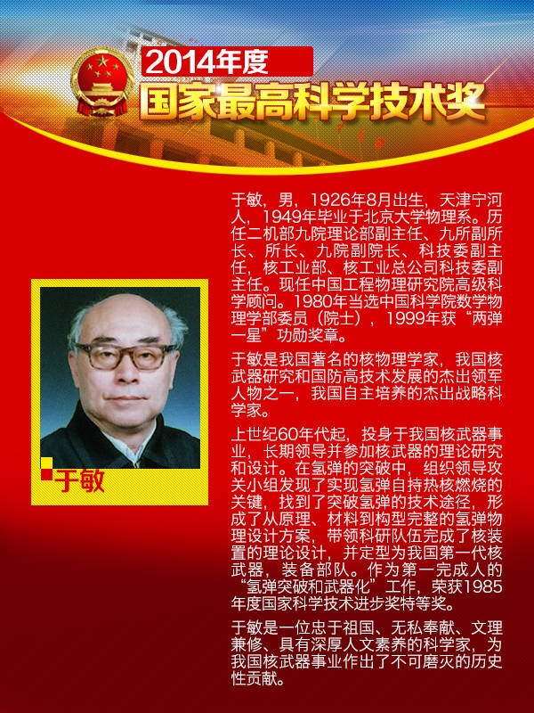周光召称他“毕生奉献、学界楷模”。荣获“两弹一星”功勋奖章、国家科学技术进步特等奖、国家自然科学奖一等奖、国防重大科技成果一等奖等十几项重大奖项的于敏,曾经为了我国的核武器研究而“隐身”长达三十年之久,甚至直到今天,他的事迹也鲜见于报端。
