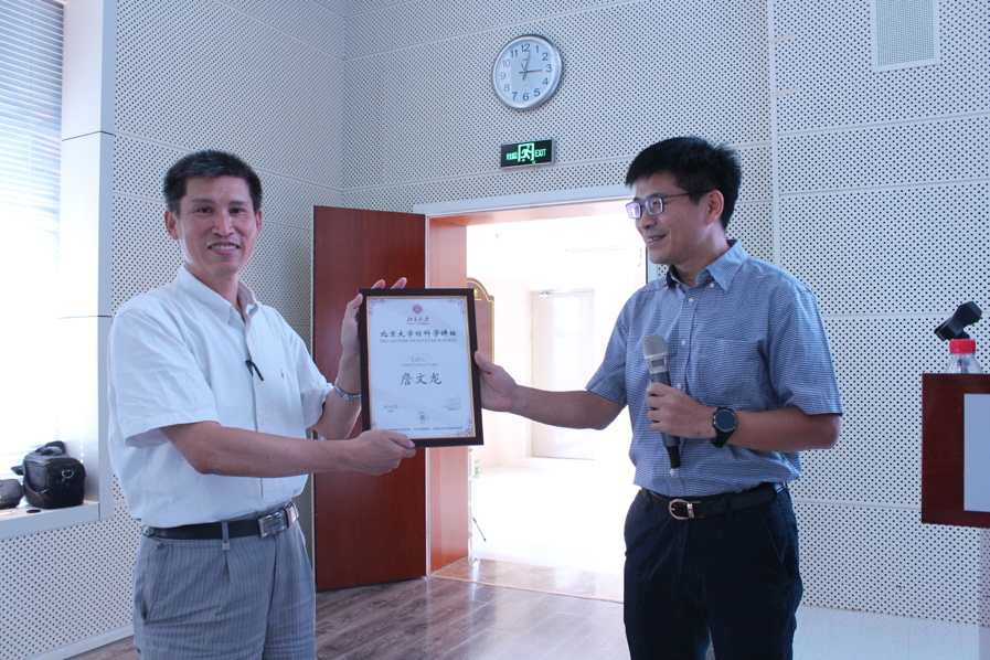 曹庆宏教授向詹文龙院士颁发“北京大学核科学讲坛”纪念证书