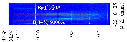 图2:LITP原理样机在极向电流5000A,对应Bp=100Gs@100mm时,120-400KeV质子束在侧向法兰探测窗口的探测信号。其中红色实线为模拟得到的质子束分布。 |