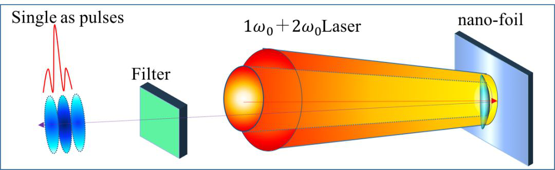 图 1:双色激光与纳米薄靶相互作用产生孤立的高亮阿秒脉光的模型图