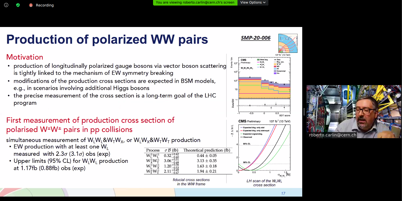 当考虑同电荷W玻色子质心系时,利用CMS实验在2016-2018收集的137/fb的13TeV对撞数据,给出单纵向W玻色子极化散射的观测(预期)敏感度为2.3(3.1)倍标准偏差。同时,也对双纵向散射分量截面给予了限制。如图所示,测量结果为0.32+0.42-0.40fb,理论预言结果为0.44+-0.05fb。