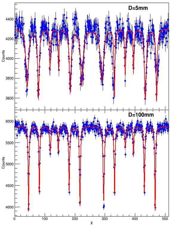 mossbSim模拟给出的穆斯堡尔谱图。上下图分别为放射源与样品之间的距离D=5mm和D=100mm时的穆斯堡尔谱。模拟表明,若想保障穆斯堡尔谱的分辨,源与样品之间需要合适的距离。