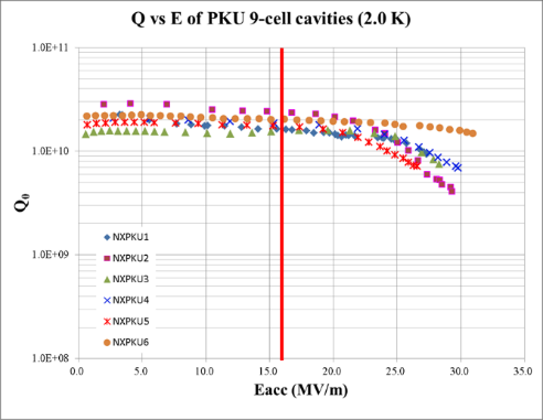 射频超导加速技术是加速器领域的高新技术,是强流高能粒子加速器,特别是连续波X射线自由电子激光所必需的技术。超导加速腔是超导加速器的核心部件。射频超导团队在攻克超导腔表面处理关键技术的基础上,研制成功批量大晶粒9-cell超导腔(图1),仅采用缓冲化学抛光处理及高温热处理,6只超导腔加速梯度全部在25MV/m以上,在16 MV/m(硬X射线自由电子激光装置预期运行梯度)和2 K温度下,超导腔品质因数在1.6-2.4x1010(图2)。按国际惯例,这批超导腔的加速梯度和品质因数在统计意义上均达到了国际先进水平。