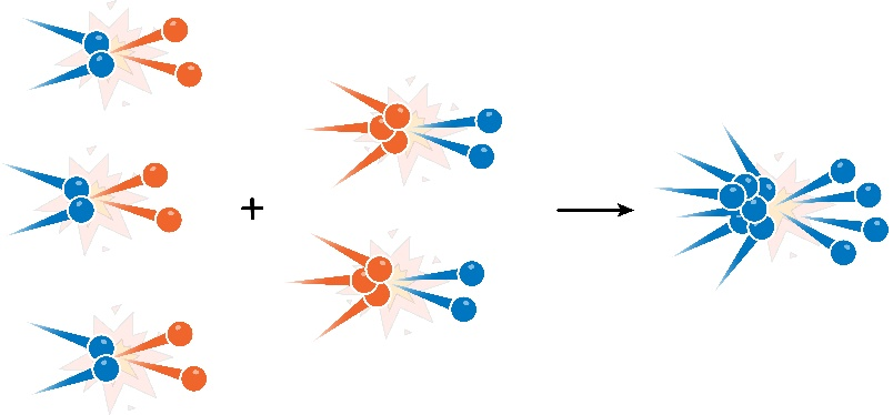 暗物质粒子湮灭过程示意图(蓝色表示暗物质粒子,红色表示催化剂粒子)