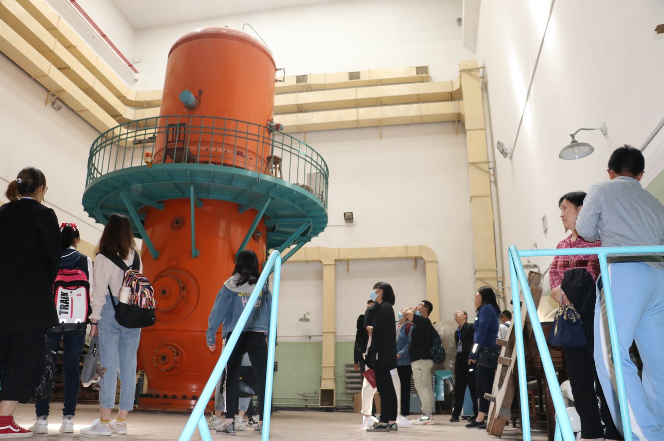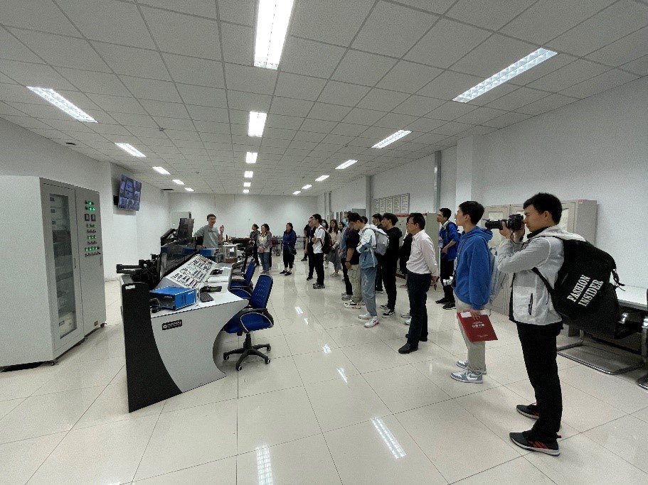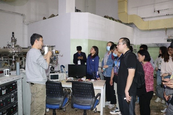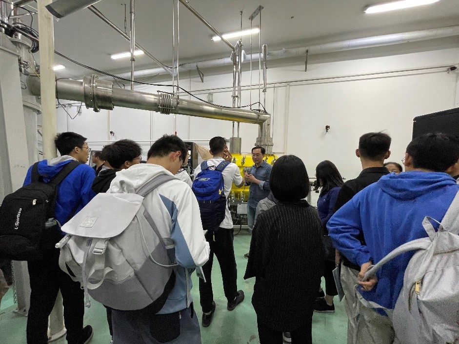 随后,师生前往技物楼去,由林林带领大家参观了射频超导加速器实验室,对该实验室的发展历程、主要研究内容、实验装置及应用等做了大致介绍,并一一回答了学生们对加速器的运行原理、运行环境的要求、运行实验数据、电子加速等方面提出的问题。该实验室建设于1988年,经过三十多年的发展,该实验团队在关键技术上实现了突破,成为国际上少数几家掌握超导加速技术的研究组,大大推动了国内超导加速技术的发展和超导腔的国产化进程。