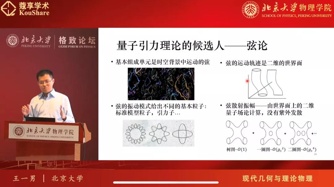 王一男在报告的第一部分“理论物理发展简史”,从牛顿力学中的欧氏几何展开,延伸到狭义相对论中的闵氏时空和广义相对论中的黎曼几何,深入浅出地讲述了物理学中时空观念的演进过程;接着,他简述了量子力学概念,介绍了引力在量子化中遇到的困难,并以此为切入点引出弦论,展示了弦论中所涉及的代数几何、量子几何和弦论与现代前沿数学之间的紧密关系。然后,他围绕“弦论是什么”这一问题,在报告的第二部分重点阐述了弦论在量子引力和量子场论两方面的应用、目前所面临的挑战,并介绍了自己在弦论中寻找最大数量真空解、几何构造超对称量子场论方面的相关研究工作。最后,他对弦论领域做了前景展望。
