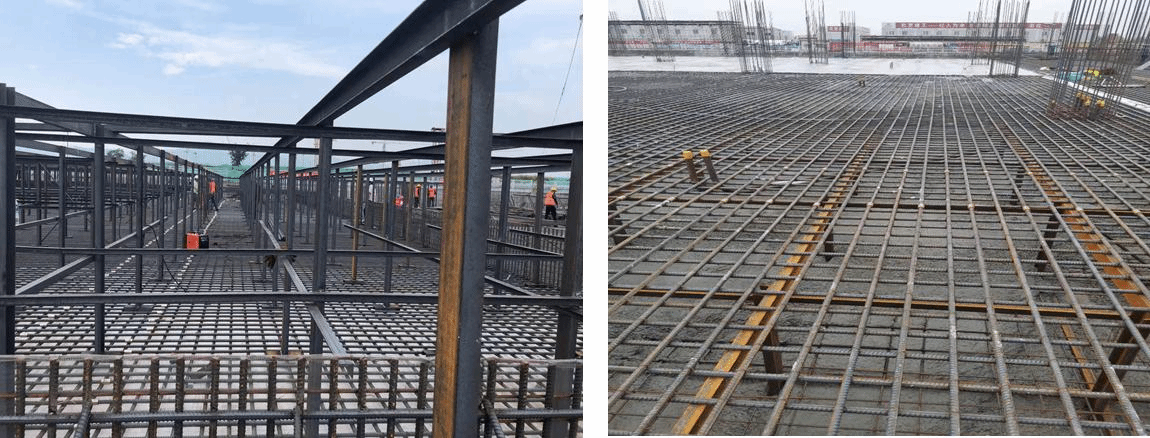 由于底板厚度大,钢筋自重及荷载过大,以往使用的钢筋马镫不能满足稳定性要求,因此选择力学性能较好的槽钢及角钢作为支撑架体构造主要材料,通过计算,严格控制马镫构造及布置间距,成排布置。确保架体满足承载力要求,保证架体稳定性。