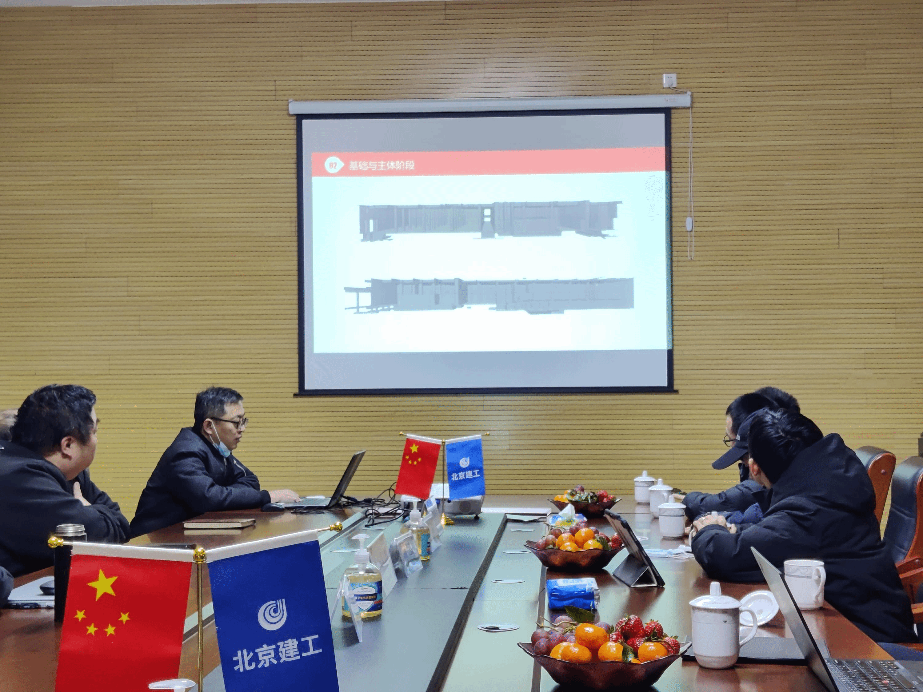施工单位北京建工集团向颜学庆教授等人详细汇报了项目工程的进展。怀柔科学城激光加速创新中心项目占地面积近30000平方米,集质子治疗、实验、办公为一体。由于项目对建筑结构有防辐射、减震等特殊要求,基础结构中存在筏板厚度2米,局部3米的超厚大体积混凝土工程,最大一次性浇筑方量为2708m³,因此建筑基础结构的混凝土浇筑尤为关键。工程筏板采用“跳仓法”施工,并严格控制混凝土配比、浇筑过程等变量,保证了工程质量符合实验室需求。