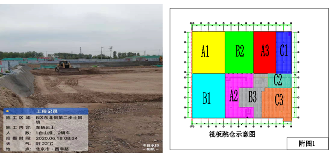 (图5 换填区施工过程(左)与跳仓法仓位图(右))