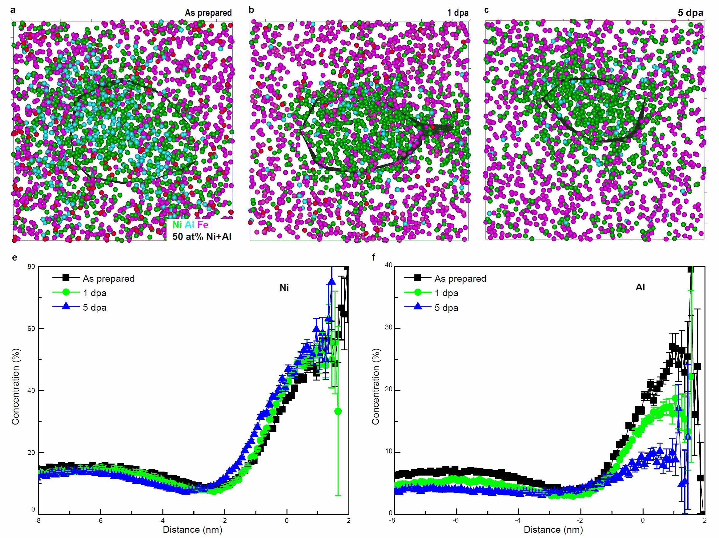 (要点:1. 为了充分了解动态溶解和再析出过程,对材料进行了室温辐照实验以揭示纳米粒子溶解过程;可以看到:在辐照达到5 dpa后粒子完全溶解;2. 溶解过程为Al被快速从析出相中敲出。)