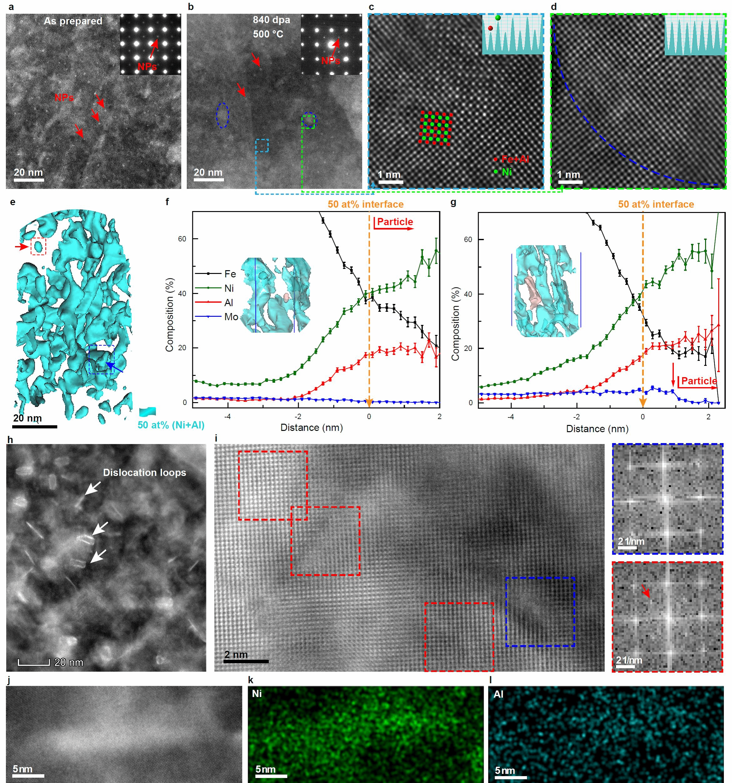(要点:1. 高温辐照前后析出相尺寸、形貌未发生明显变化。相应的原子分辨HAADF-STEM图显示辐照后其有序结构得以保留,同时观察到富Ni区域,结合原子分辨STEM和APT分析可以发现,富Ni区域表现出无序结构,同时在这些富Ni区域内部可以观测到有序纳米粒子;2. HAADF-STEM图可以观察到辐照引入位错环及与位错环相邻的有序纳米粒子存在,辐照引入的位错被纳米粒子有序-无序转变后修复,EDS分析表明修复后的位错环痕迹富Ni,而Al则均匀分布。)