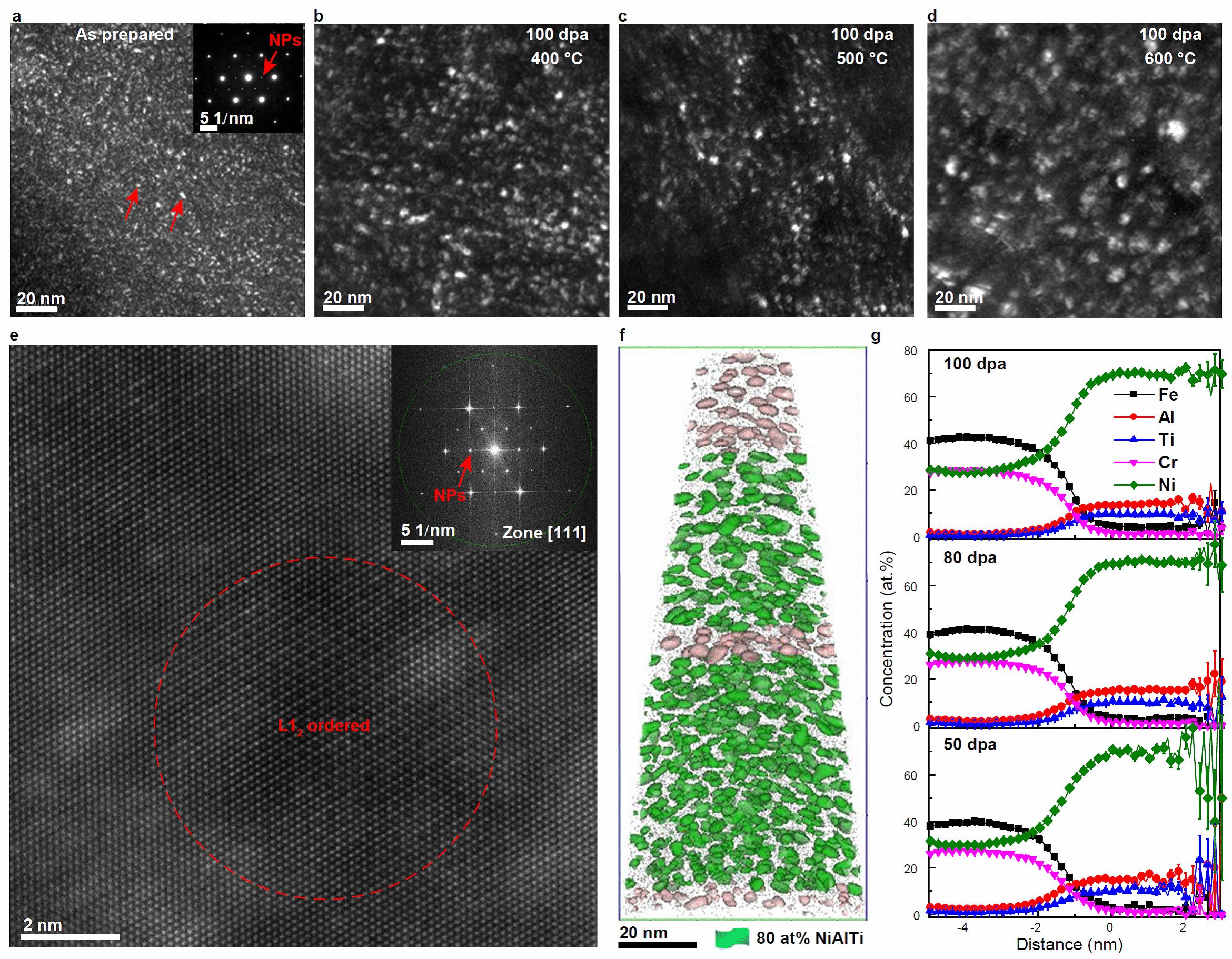 图1. 含高密度Ni(Al,Fe)纳米粒子的超晶格钢在离子辐照条件下的超高耐辐照性能。图b和c比较表明该超晶格钢具有很高的抗辐照肿胀性能