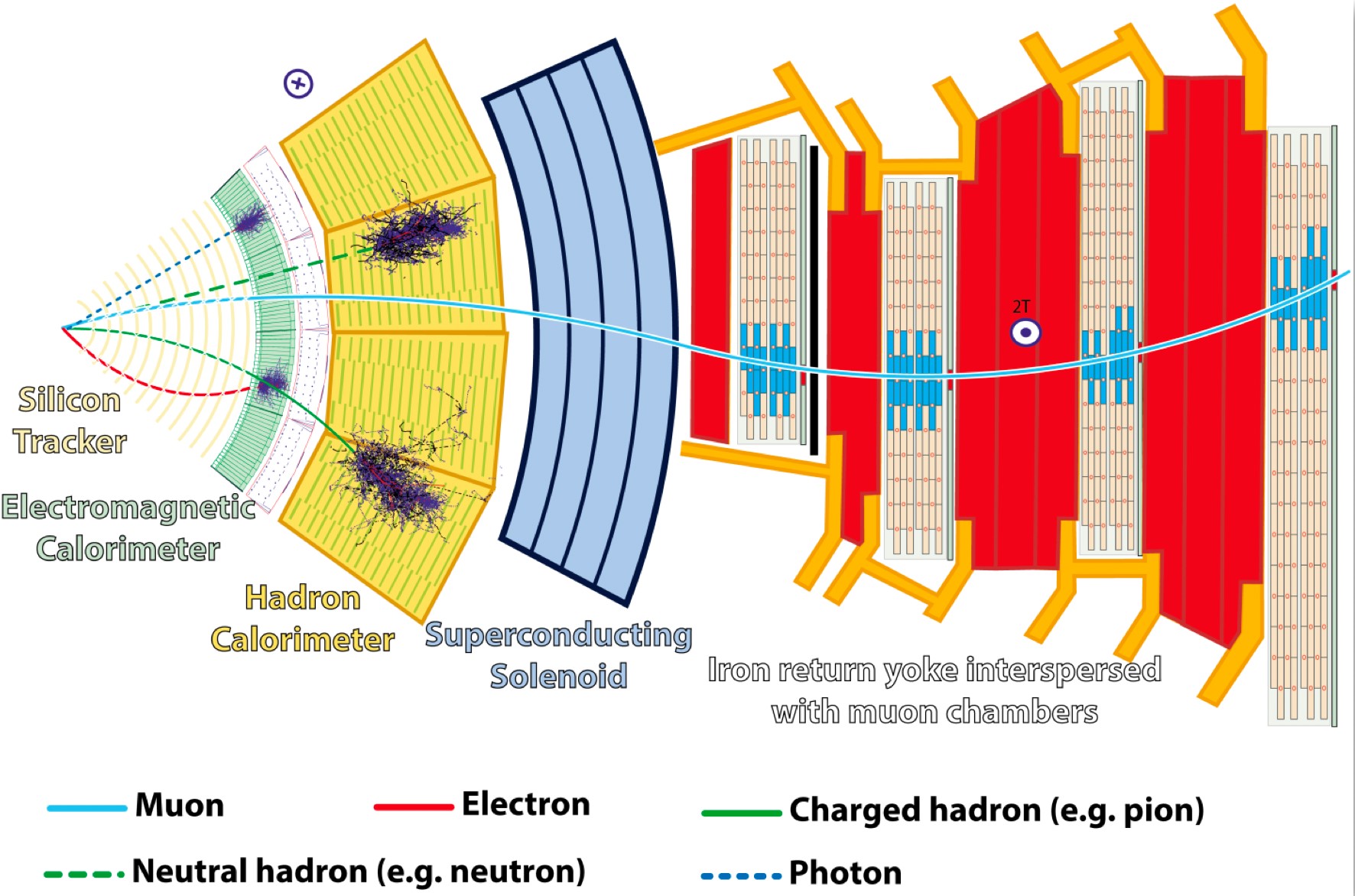 更外圈的部分为量能器,这个部分做的非常的厚重,大部分粒子会无法穿透这部分,停留在其中。粒子在其中发生集联簇射全部损毁在其中,这样可以通过探测器将粒子的能量收集起来,再通过重建算法得到粒子的能量。其中有个粒子非常的特殊(缪子),它具有非常强的穿透能力,可以穿透并且飞到量能器之外,所在在更外层的部分,我们设置了专门的缪子探测器。磁铁外圈具有和内圈反向的磁场,缪子带电也会发生偏转,像内部的径迹室一样,缪子在缪子探测器中也会留下运动轨迹,我们可以据此测量缪子的动量。CMS相比其他探测器的一个重要的特点在于它可以对缪子进行非常精确的测量。如果一个物理过程的末态产生了缪子,我们可以通过缪子对这个物理过程进行精确的测量,从而对其中涉及到的物理量达到一个更高的精度。对撞过程产生的缪子不多,大约占所有粒子总数的百分之一,但是由于我们对缪子的测量比较的精确,很多重要的新粒子或者新物理过程都有缪子末态,所以它非常的重要。当年的希格斯粒子发现有一个非常重要和清晰的衰变道,就是四缪子末态。