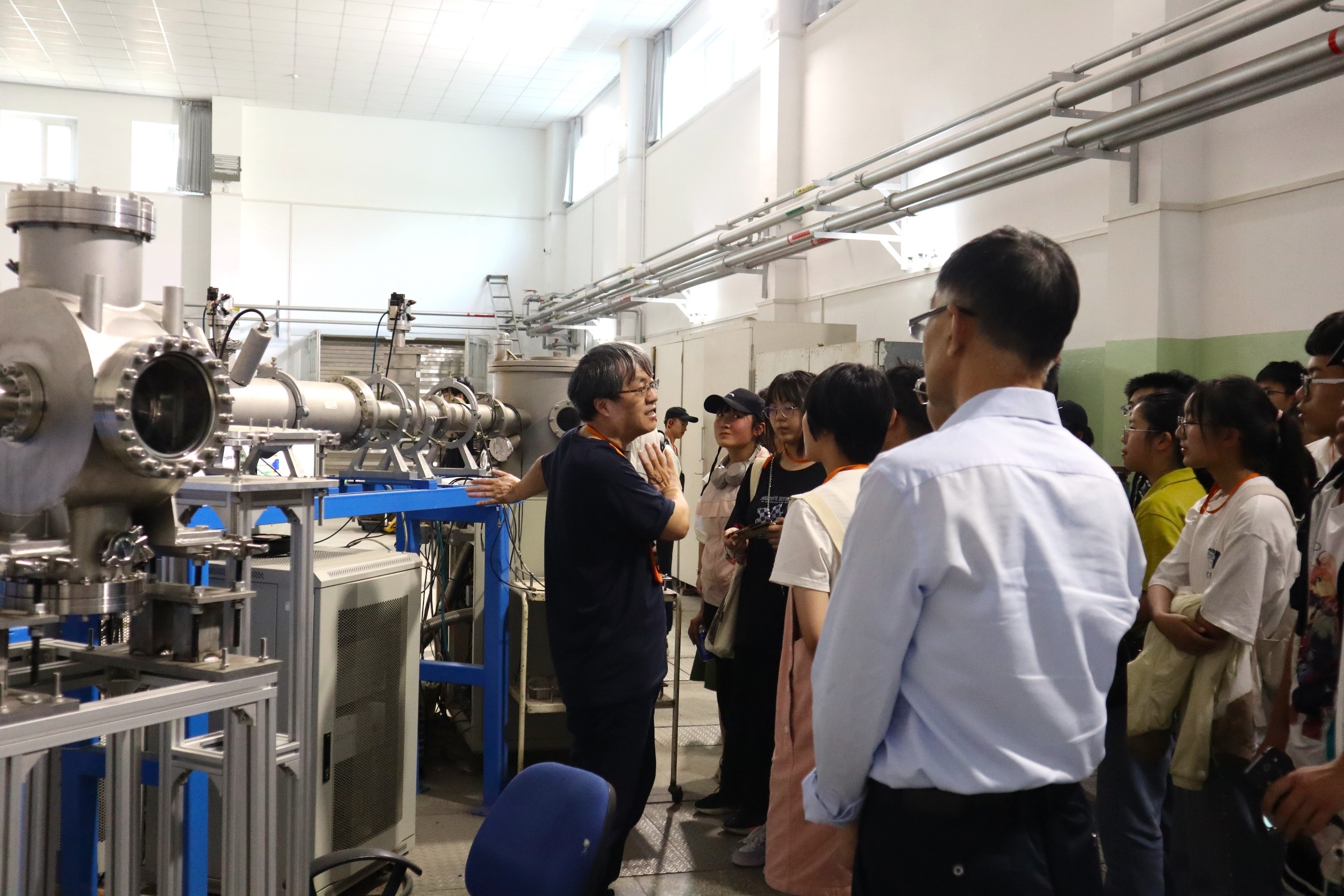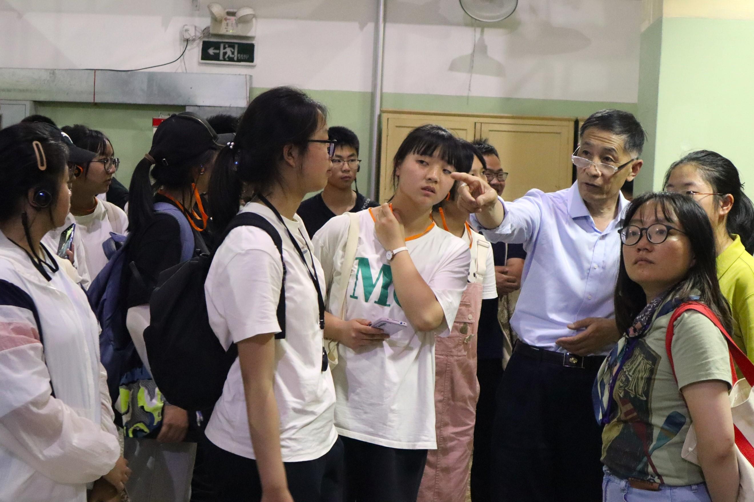 北京师范大学白明教授也在热心地给学生们普及加速器的一些常识。他生动地比划着加速器的工作原理,讲述了加速器通常由一系列加速模块组成,每个模块都包含一个电场和一个磁场,这些模块必须精确地设计和制造,以确保加速器的稳定性和精度。学生们切实感受到了加速器的美在于它们的巨大规模和精密设计。