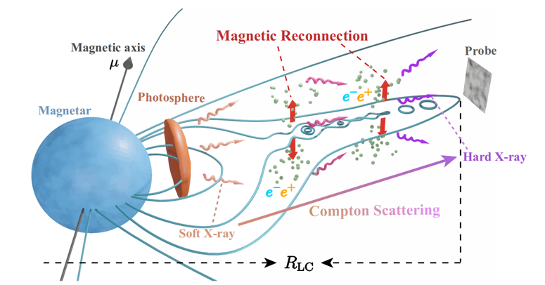 图 1:FRB 200428-X的QED磁重联起源模型示意图