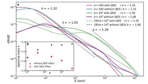 图 2:由磁重联驱动加速的电子能谱及其对应的幂律指数随不同磁化参数的变化