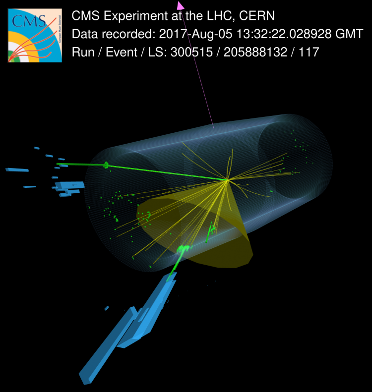 图1:CMS候选事例展示。黄色锥形展示了由ParticleNet算法标记的希格斯玻色子衰变到正反粲夸克对形成的大半径喷注。