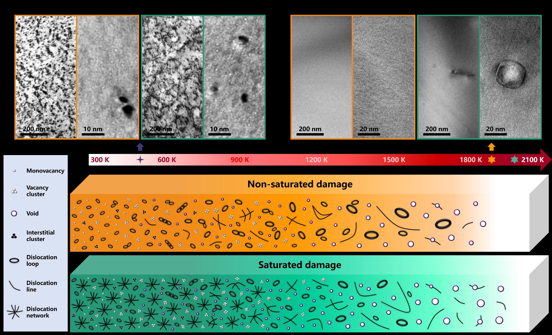 图1. “非饱和损伤”和“饱和损伤”钨中离位损伤缺陷热演化的示意图及两个关键温度点所对应的透射电镜图像