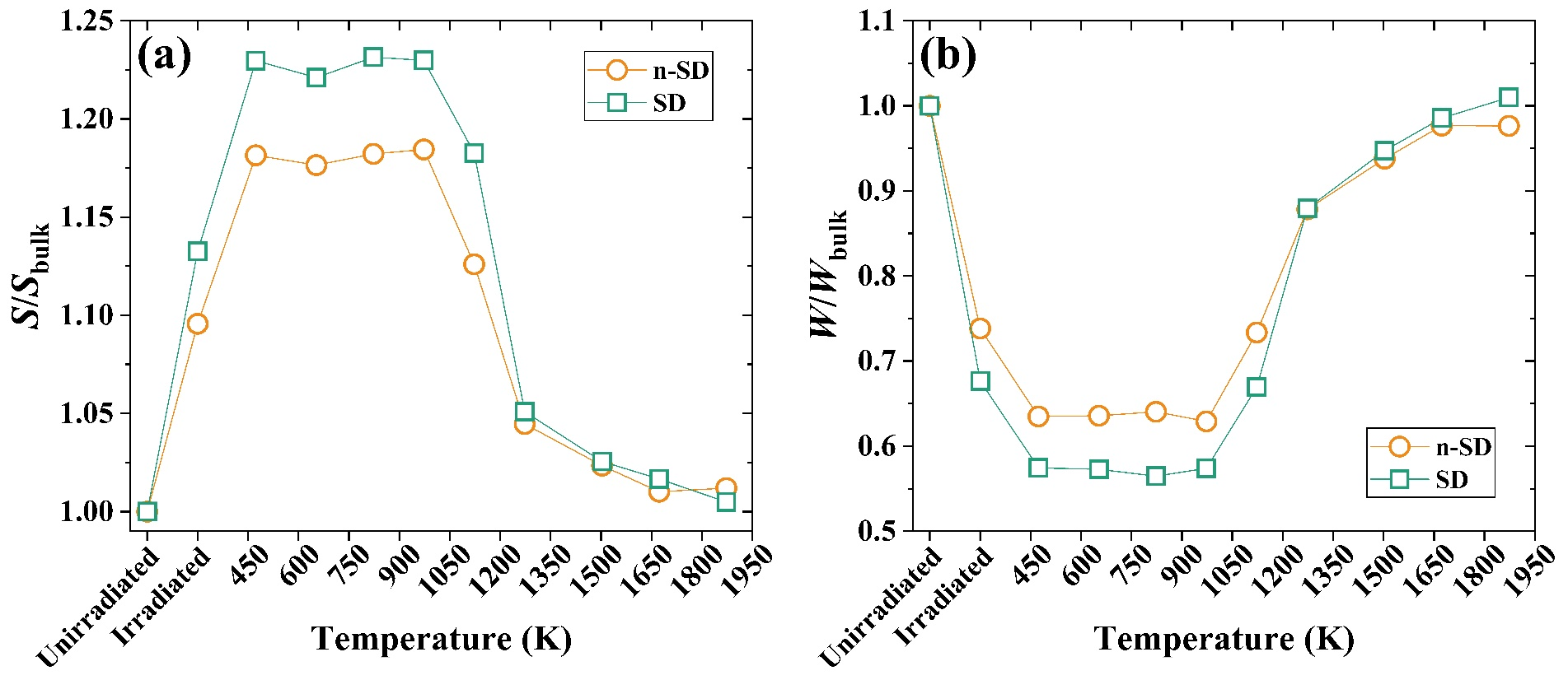 在核材料领域,一个长期关注的问题是不同初始缺陷浓度(在损伤饱和极限以下和以上)对离位损伤回复的影响。在本工作中,我们以金属钨为范例,系统研究了“非饱和损伤”与“饱和损伤”钨中离位损伤回复的温度依赖性。通过结合透射电镜与多普勒展宽正电子湮没谱表征方法,提供了宽温区内离位损伤缺陷热演化的物理图像(见图1与图2)。研究结果表明,钨中不同的初始缺陷浓度导致离位损伤回复存在明显差异,但对离位损伤缺陷演化的温度依赖性没有显著影响。在“非饱和损伤”和“饱和损伤”钨中,温和的与剧烈的离位损伤回复分别发生在973 K以下与1123 K以上。最值得注意的是,在473 K退火后,两类样品中均观察到纳米尺寸空洞。在1873 K退火后,“非饱和损伤”钨中离位损伤缺陷已完全回复,而“饱和损伤”钨中仍存在一些位错与空洞。我们推测“饱和损伤”钨中离位损伤的完全回复温度约为2000 K。综上,离位损伤回复阶段的再审视充分表明了涵盖非饱和与饱和缺陷浓度情景的重要性。因此,我们对重离子辐照钨中离位损伤的回复阶段及其所对应的温度区间进行了再定义,包括阶段I(20 K–室温)、阶段II(室温–653 K)、阶段III(653–1123 K)和阶段IV(1123–2000 K)。