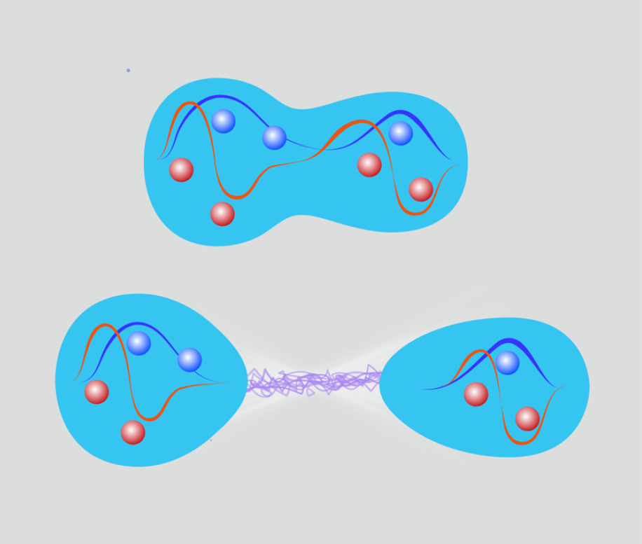 图: 核裂变前的非局域波函数,由于快速分离而保持着非局域性,从而产生远距离的量子纠缠的示意图