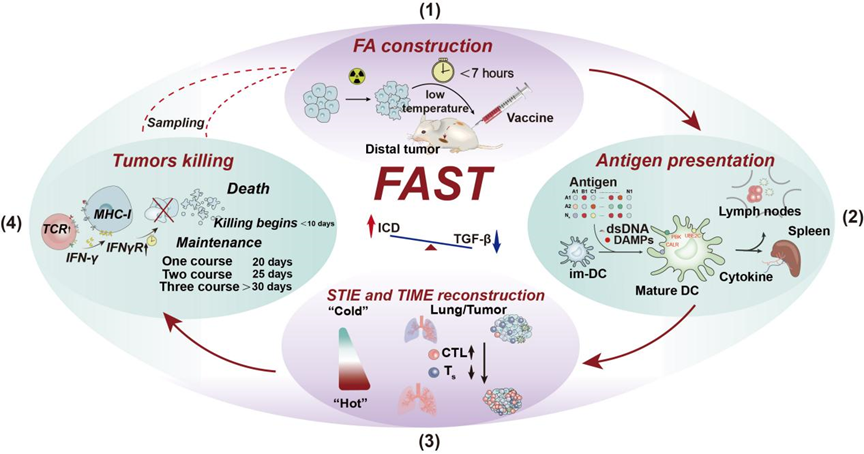 近日,北京大学物理学院重离子物理研究所、核物理与核技术全国重点实验室杨根课题组提出一种体外放疗-体内免疫激活的新理念,首次成功实现了高效个体化多癌种癌症疫苗(FAST)的快速制备。相关研究成果于2025年3月26日以“片段化自体抗原刺激的T细胞免疫疗法”(Fragment Autoantigens Stimulated T-cell-immunotherapy (FAST) as a Fast Autologous Cancer Vaccine)为题在线发表于《先进科学》(Advanced Science)。