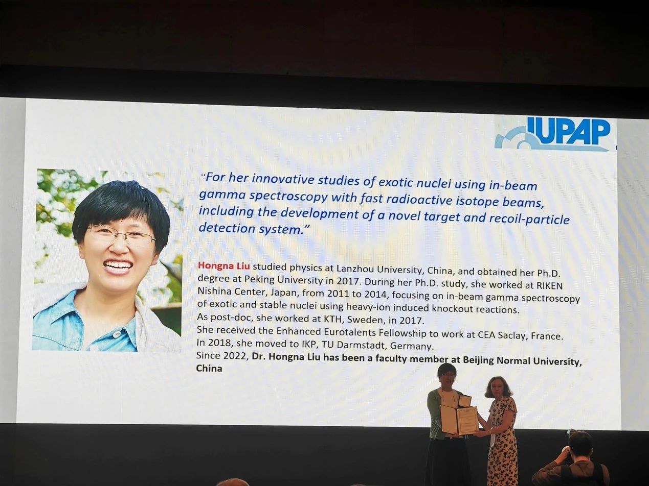 北京大学物理学院技术物理系、核物理与核技术全国重点实验室2017届博士毕业生胡柏山(现任美国Texas A&M University - College Station研究助理教授)和刘红娜(现任北京师范大学物理与天文学院研究员)获奖,二人分别因“开创性的从头计算核理论扩展用于精确计算重核和强变形核,推进了我们对核结构、致密核物质和超越标准模型物理的理解”(for pioneering ab initio nuclear theories that extend precision calculations to heavy and strongly deformed nuclei – advancing our understanding of nuclear structure, dense nuclear matter, and physics beyond the Standard Model),和“利用快放射性同位素束流的在束伽马谱学对奇特原子核所开展的创新性研究,包括开发了一种新型靶和反冲粒子探测系统”(for her innovative studies of exotic nuclei using in-beam gamma spectroscopy with fast radioactive isotope beams, including the development of a novel target and recoil-particle detection system)而荣获表彰。