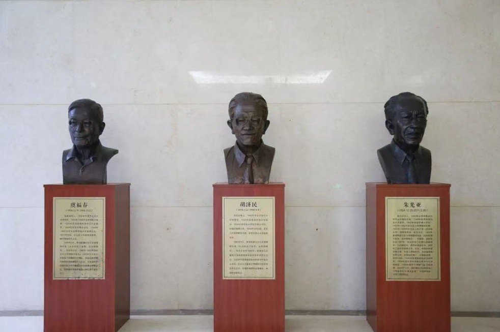 矗立在核物理与核技术全国重点实验室的虞福春、胡济民、朱光亚铜像(孙嘉琪摄于北京大学加速器楼门厅)