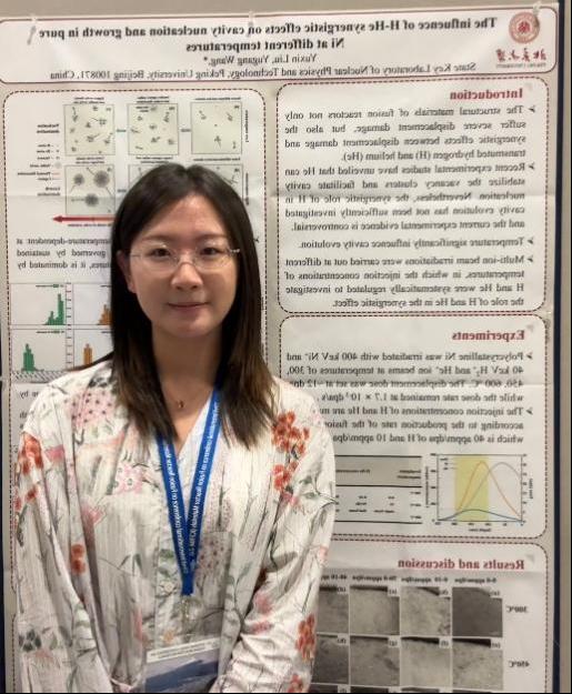 此外,博士生刘雨昕也以题为《The influence of H-He synergistic effects on cavity nucleation and growth in pure Ni at different temperatures》的海报,展示了她在多束离子同时辐照中所取得的创新性成果。该研究系统揭示了不同辐照温度下空腔形核与生长随氢氦注量的变化规律,阐明了温度对空腔演化机制的影响,以及氢、氦在不同温度下所发挥的作用。研究进一步指出,空腔的形核与生长是辐照条件与材料环境多种因素竞争的结果。