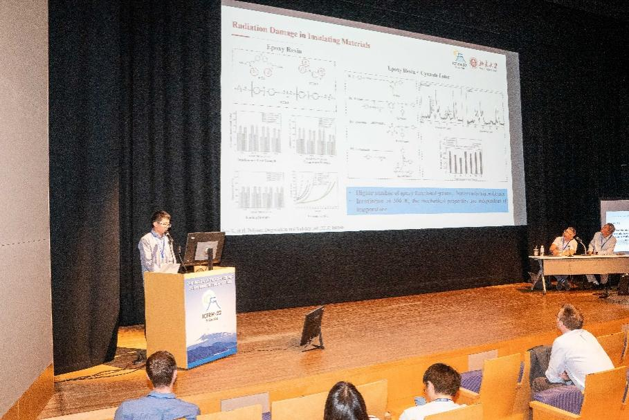 博士生张宝山在题为《Mechanistic exploration of insulation materials low-temperature irradiation damage through multiscale simulation coupled with experimental validation》的口头报告中介绍了他在超导磁体用低温绝缘树脂的γ射线辐照效应的实验及理论模拟工作。针对目前业界在室温及大气环境下辐照测评低温绝缘树脂与其真实服役环境不同可能出现的问题,他通过系统比较室温、低温、大气及真空环境下γ射线辐照绝缘树脂的实验结果,和理论模拟,得出室温大气环境中辐照对低温绝缘树脂的性能测评存在误导。这是该会议上首次提出在低温真空环境下辐照测评低温绝缘树脂的重要意义。