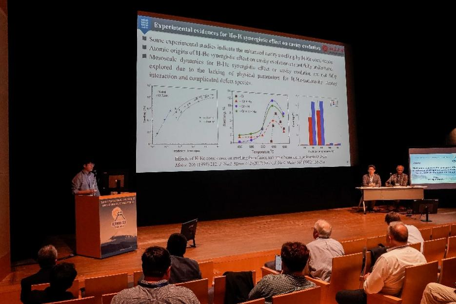 王晨旭研究员在题为《Helium-Hydrogen Synergistic Effects in Structural Materials in Fusion Reactors》的邀请报告中,从三束离子辐照平台建设、辐照实验与计算模拟结果、基于三束离子辐照预测聚变中子辐照肿胀的方法构建及实验验证几个方面,系统介绍了近年来北大团队在聚变中子氢氦协同损伤效应研究以及现阶段聚变堆结构材料的有效性能评价等方面取得的研究进展。该报告凭借其系统性、创新性及实验与理论的深度结合,引发了与会专家的广泛讨论,为国际聚变堆材料领域的研究提供了新思路。