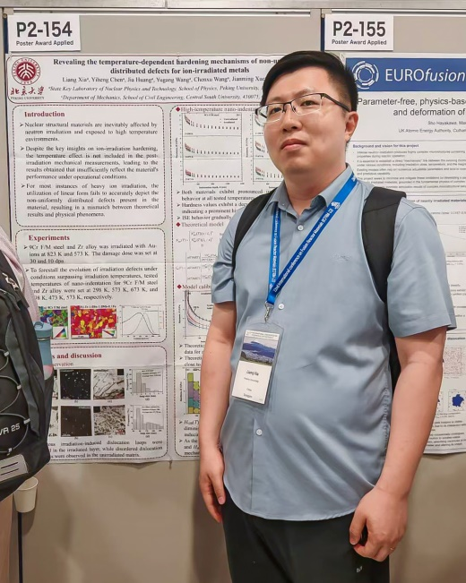 博士后夏梁通过海报展示了团队近期在核能材料辐照损伤方面取得的重要研究成果。该工作以《Revealing the temperature-dependent hardening mechanisms of non-uniformly distributed defects for ion-irradiated metals》为题,系统揭示了关键核能结构材料在辐照-高温耦合下的微观结构演化及力学行为变化,并通过理论建模的方式进一步给出了影响材料辐照硬化行为的关键机制及其随压痕深度、温度等参数的演化规律。