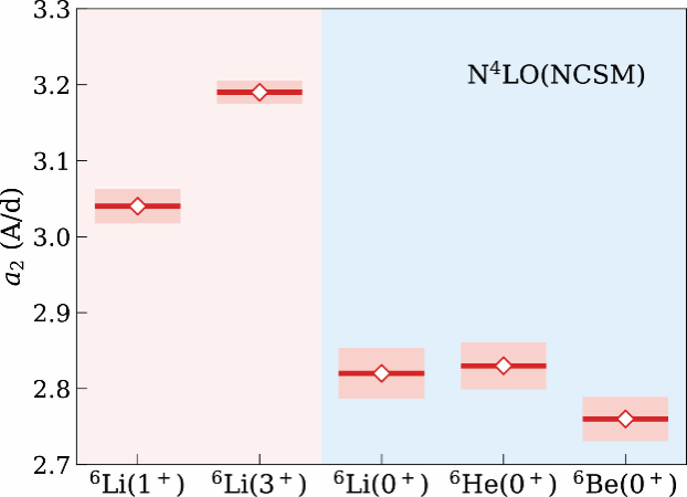 最近课题组采用无核芯壳模型NCSM和N4LO手征核力,从第一性原理出发计算了轻核的短程关联标度因子a2。这是首次采用NCSM来计算a2,并发展了在动量空间去除多体质心运动的新方法。与已有的量子蒙卡VMC计算相比,NCSM的优势在于可以采用手征核力,并可以研究不同的核态,包括自旋、宇称、同位旋等对短程关联成分的影响。