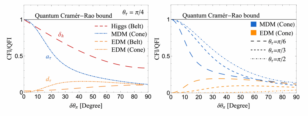 图 2:当圆锥开角 δθπ趋于0时,Higgs–τ 汤川耦合中 CP 破坏耦合和τ轻子磁偶极矩的对撞机测量可以达到量子Cramér–Rao极限,而τ轻子电偶极矩的测量则始终存在不可消除的差距