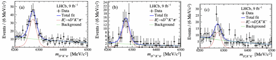 Bc+介子到D+K+π-、D*+K+π-、D+sK+K-衰变的不变质量谱及拟合,红色虚线代表信号。