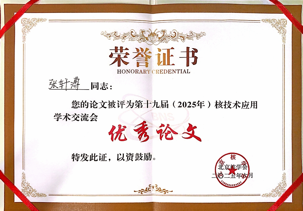 张轩溥获得第十九届(2025年)核技术应用学术交流会优秀论文奖