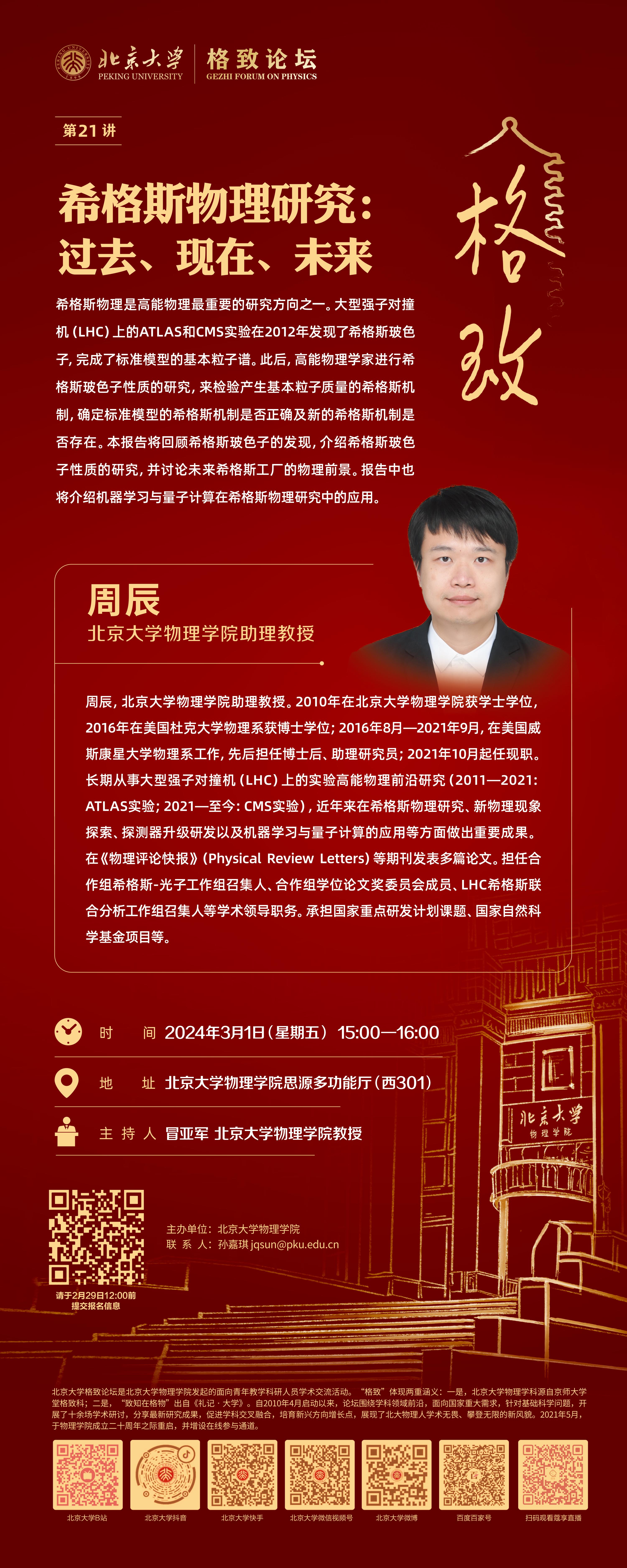 周辰,北京大学物理学院助理教授。2010年在北京大学物理学院获学士学位,2016年在美国杜克大学物理系获博士学位;2016年8月至2021年9月,在美国威斯康星大学物理系工作,先后担任博士后、助理研究员;2021年10月起任现职。长期从事大型强子对撞机(LHC)上的实验高能物理前沿研究(2011年至2021年:ATLAS实验;2021年至今:CMS实验),近年来在希格斯物理研究、新物理现象探索、探测器升级研发以及机器学习与量子计算的应用等方面做出重要成果。 在《物理评论快报》(Physical Review Letters)等期刊发表多篇论文。担任合作组希格斯-光子工作组召集人、合作组学位论文奖委员会成员、LHC希格斯联合分析工作组召集人等学术领导职务。承担国家重点研发计划课题、国家自然科学基金项目等。