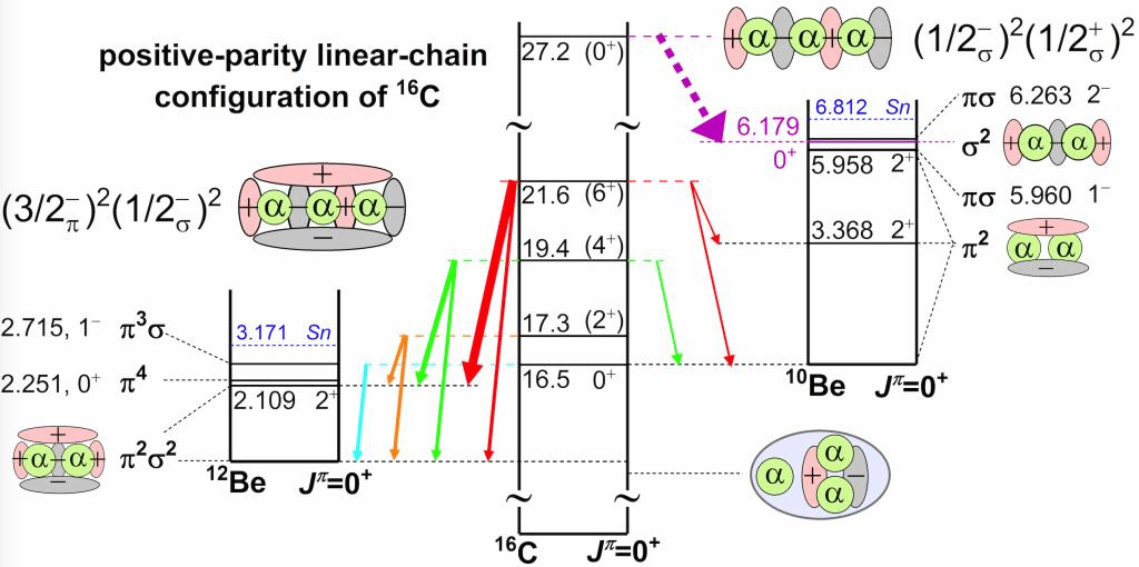 图1:16C的线性链状分子带成员的构型及其选择性衰变示意图。实线箭头宽度正比于衰变概率。