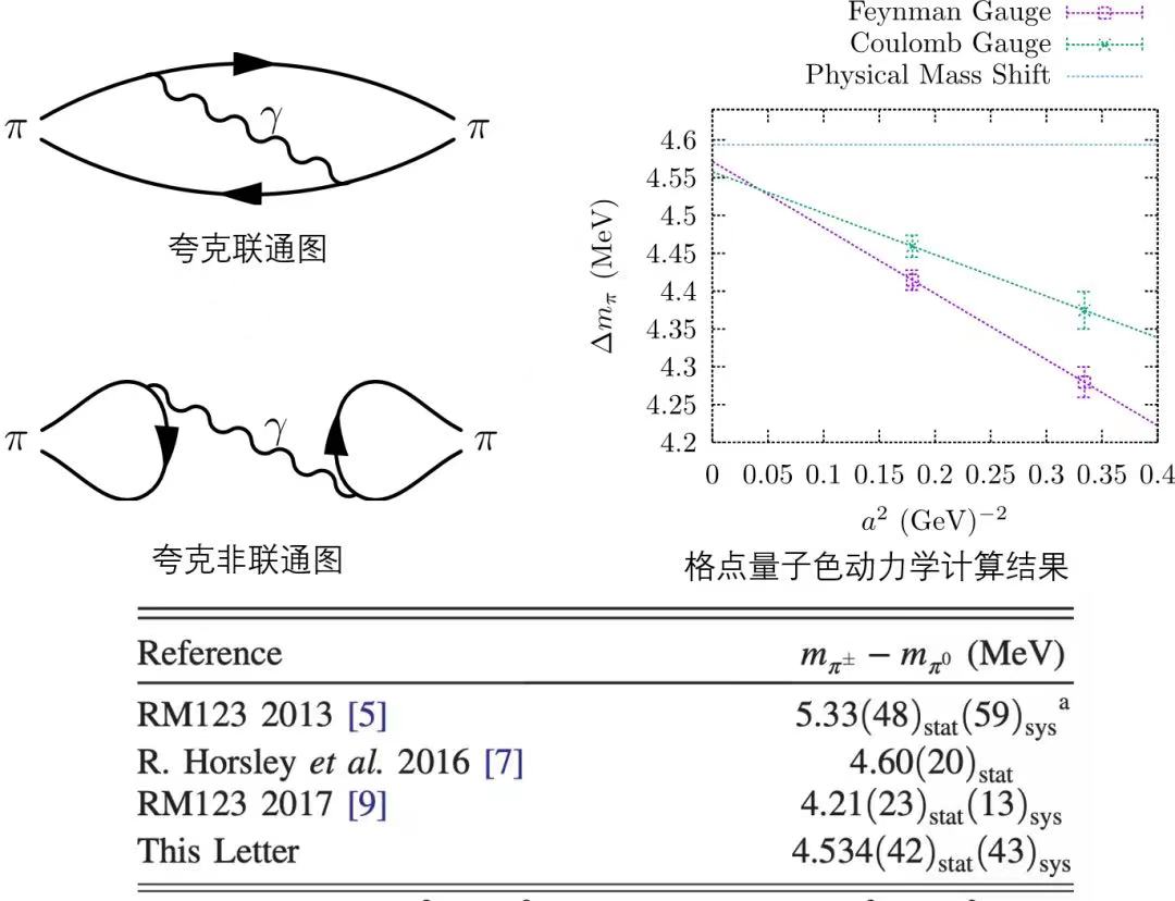 北京大学物理学院理论物理研究所、核物理与核技术国家重点实验室冯旭研究员与美国康涅迪格大学物理系靳路昶助理教授、M. J. Riberdy博士合作,用格点QCD系统计算了带电π介子和中性π介子的质量差(π介子被用来解释质子和中子之间的核力,是推进现代原子核理论发展的一个重要基本粒子;日本物理学家汤川秀树和英国物理学家鲍威尔因提出、首次发现π介子,相继获得1949年度和1950年度诺贝尔物理学奖)。对π介子质量差的研究可以追溯到上世纪60年代,T. Das等人曾利用温伯格的求和规则和流代数来计算,系列工作对求和规则和手征微扰理论的发展起到促进作用。