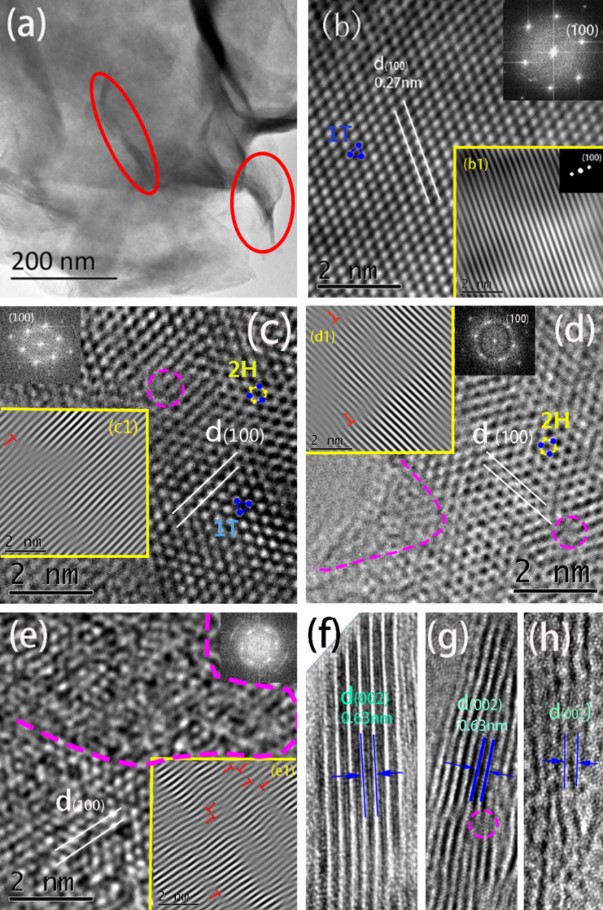 图1 (a)未辐照二硫化钼纳米片的低倍透射电镜(TEM)图像;(b)未辐照二硫化钼纳米片的高分辨TEM图像以及相应的FFT图像;(c–e)辐照剂量分别为5 × 1012 cm−2 (MoS2-irra1), 2 × 1013 cm−2 (MoS2-irra2)以及5 × 1013 cm−2 (MoS2-irra3)的二硫化钼纳米片的高分辨TEM图像以及相应的FFT图像;(f-h) MoS2-irra1, MoS2-irra2以及MoS2-irra3纳米片的层间结构TEM图像。其中红色“T”代表位错,玫红色区域为无序区域,蓝色和黄色球体分别代表钼原子和硫原子