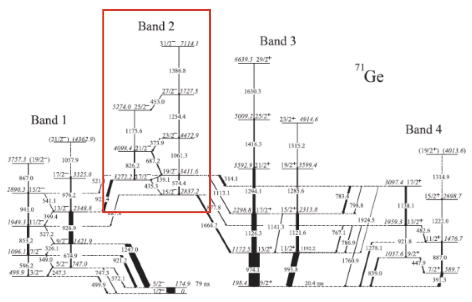 图1: 本研究建立的Ge-71能级纲图。加红框的为新发现的八极转动带。