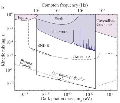 图二:对质量在4.1 feV到 2.1 peV的暗光子和光子混合的限制。