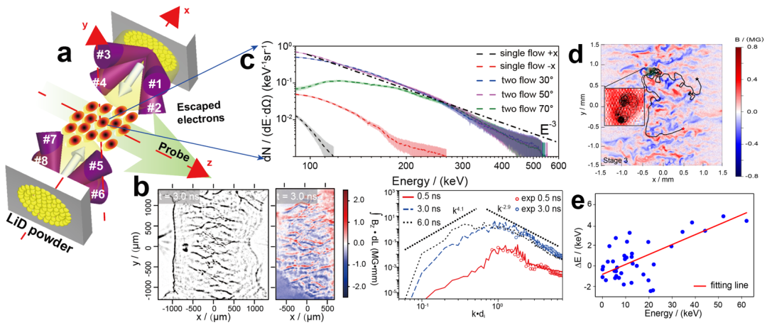 图2 电子随机加速实验。a.实验布局图,b.光学诊断测量的非线性Weibel不稳定性诱导产生的动理学湍流等离子体,c.典型热电子背景能谱和非热电子能谱,d.理论模拟给出电子随机加速的运动轨迹,e.电子每次碰撞后获得的能量增益