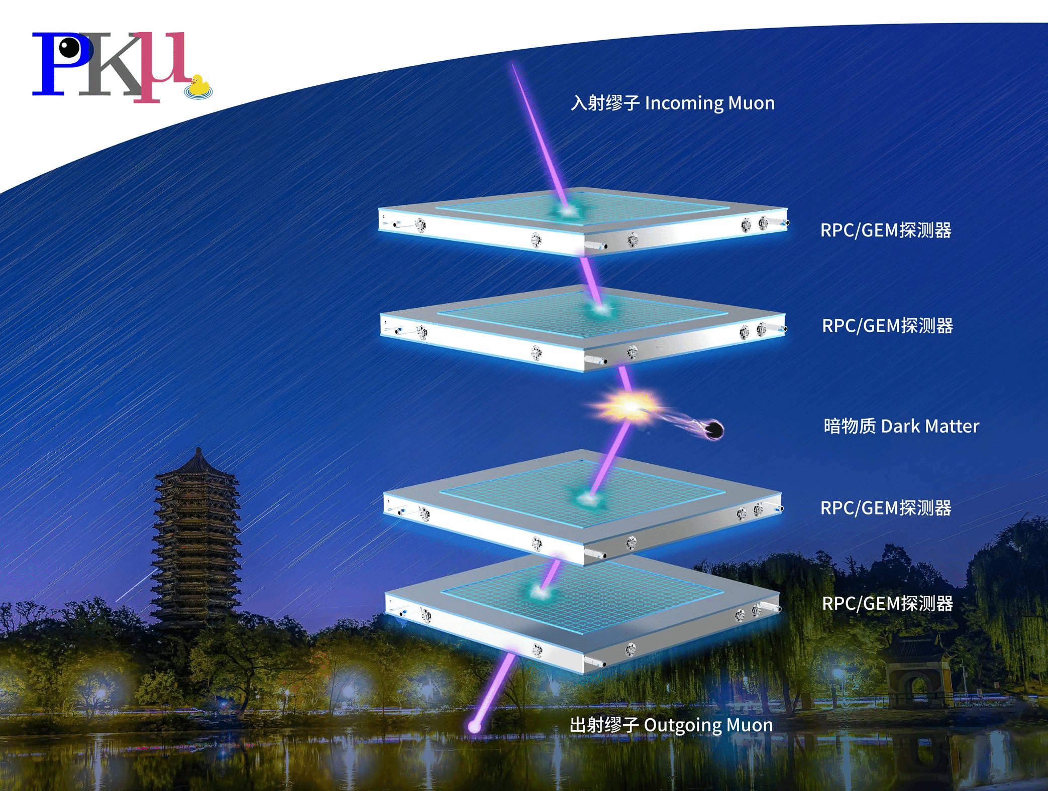 该实验项目被命名为PKMu (Probing and Knocking with Muon),旨在利用缪子探测器来直接探测轻质量暗物质。实验方案借助并推广了缪子散射成像的算法,通过测量入射和出射缪子轨迹的夹角和散射点等信息,来探测缪子与灵敏体积内暗物质可能的相互作用。研究团队初步设计的宇宙射线缪子散射探测系统由位置灵敏的多层气体电子倍增器(GEM)和阻板室气体室(RPC)组成。