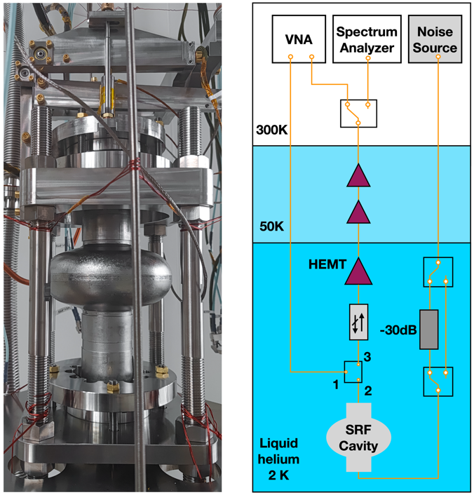 图1:左:安装调谐器的超导腔实物图;右:实验电路设计图
