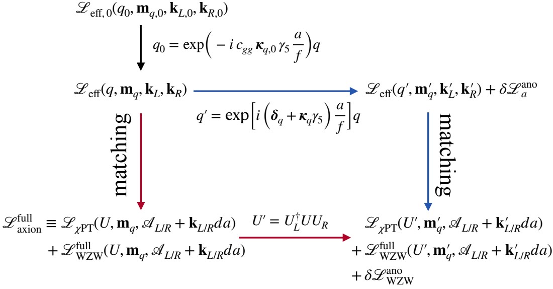 近期,刘佳课题组与合作者在该方向上取得了重要理论进展,建立了包含轴子的WZW相互作用的自洽理论,可以描述轴子与基本规范玻色子(如光子和中性Z玻色子)以及复合赝标量和(轴)矢量介子的完整相互作用。该理论将轴子的微分1-形式作为背景矢量场引入WZW相互作用,同时引入轴子的非平庸抵消项,保证了标准模型规范相互作用的规范不变性。上述含抵消项的轴子WZW相互作用拉氏量与正常的手征拉氏量一起,构成了轴子-介子相互作用的完整理论。在该理论框架下的物理系数不依赖于夸克手征基选取。轴子夸克层次的有效拉格朗日量关系和介子层次手征拉格朗日量的匹配示意图见图一。