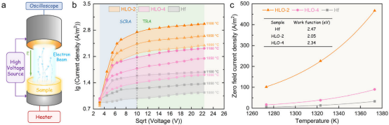 图2. (a) 热电子发射示意图;(b) 热电流发射曲线;(c)零场电流密度曲线及逸出功。