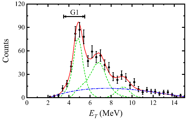 近期,北京大学物理学院技术物理系、核物理与核技术全国重点实验室的李智焕和华辉课题组与美国密歇根州立大学的Kyle Brown等合作者对质子滴线外非束缚核21Al开展了研究。利用美国国家超导回旋加速器实验室提供的20Mg放射性次级束,通过其在9Be靶上的单质子俘获反应,布居了质子滴线外21Al核的高激发共振态,并对这些共振态瞬发衰变产生的四个末态粒子(3p+18Ne)进行了完全符合测量。利用不变质量法构建了21Al核的衰变能谱(见图1),首次观察到21Al核中的三质子共振态。