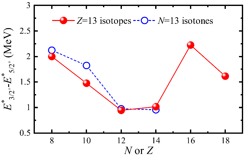 图3:Z(N)=13同位素(同中子素)中5/2+基态和最低的3/2+激发态的能量差系统学