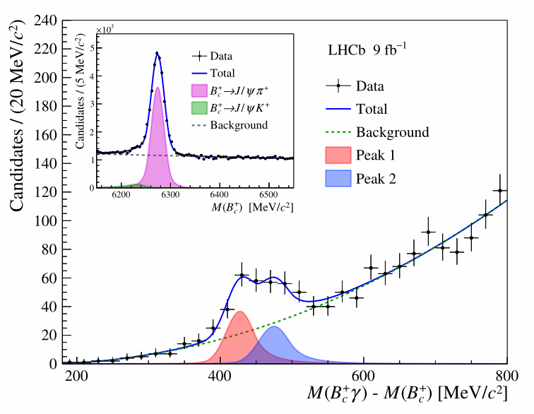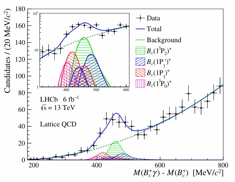 近日,欧洲核子研究中心大型强子对撞机底夸克实验(LHCb)北京大学研究团队首次在实验中观测到由底夸克和粲夸克组成的Bc+介子的轨道激发态,并测量了其质量和相对基态的产生截面,在重味强子谱学研究中取得新的重要进展。2025年12月3日,相关研究成果分别以“Bc+介子轨道激发态的发现”(Observation of orbitally excited Bc+ states)和“Bc+γ质量谱中Bc(1P)+态的研究”(Study of Bc(1P)+ states in the Bc+γ mass spectrum)为题,发表于《物理评论快报》(Physical Review Letters)和《物理评论D》(Physical Review D),并双双获得编辑推荐(Editors’ Suggestion)。